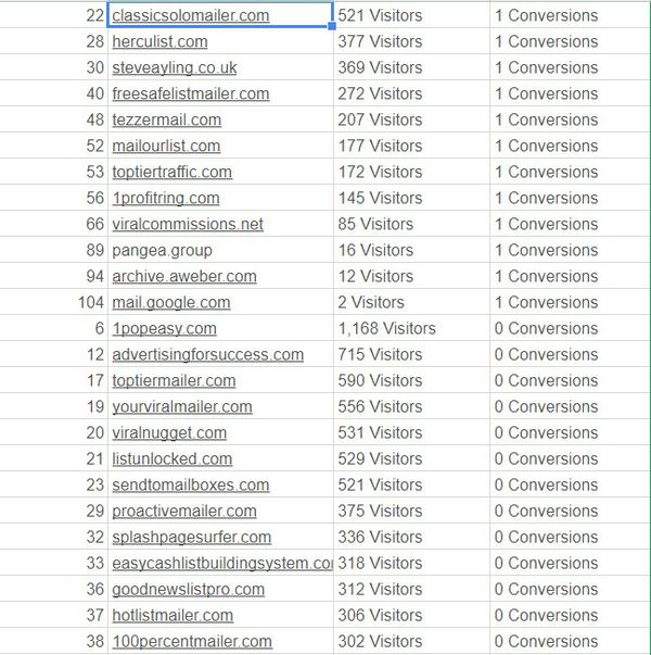 You can see that I used 107 different traffic sources. Only 36 of them generated any signups. The majority (71 sites) didn't generate even one signup.